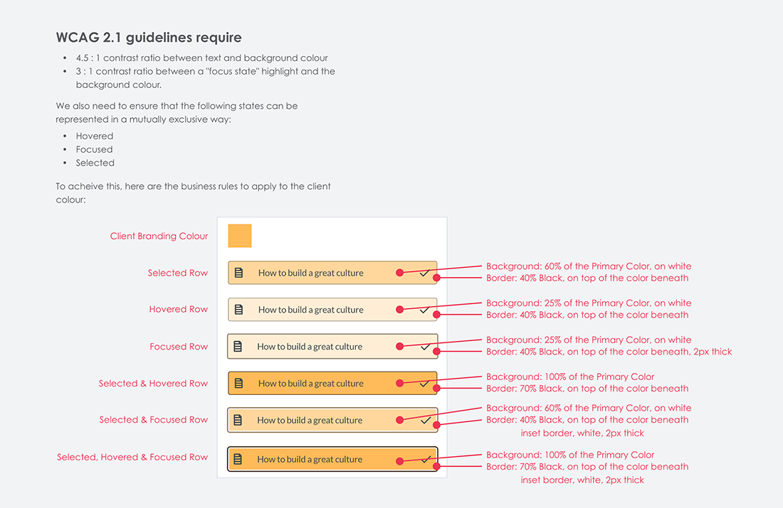 The process was short, done on whiteboards (no photos, sorry!) and involved quick design reviews with the team. I've included some examples of how I spec out this kind of work for the dev team.