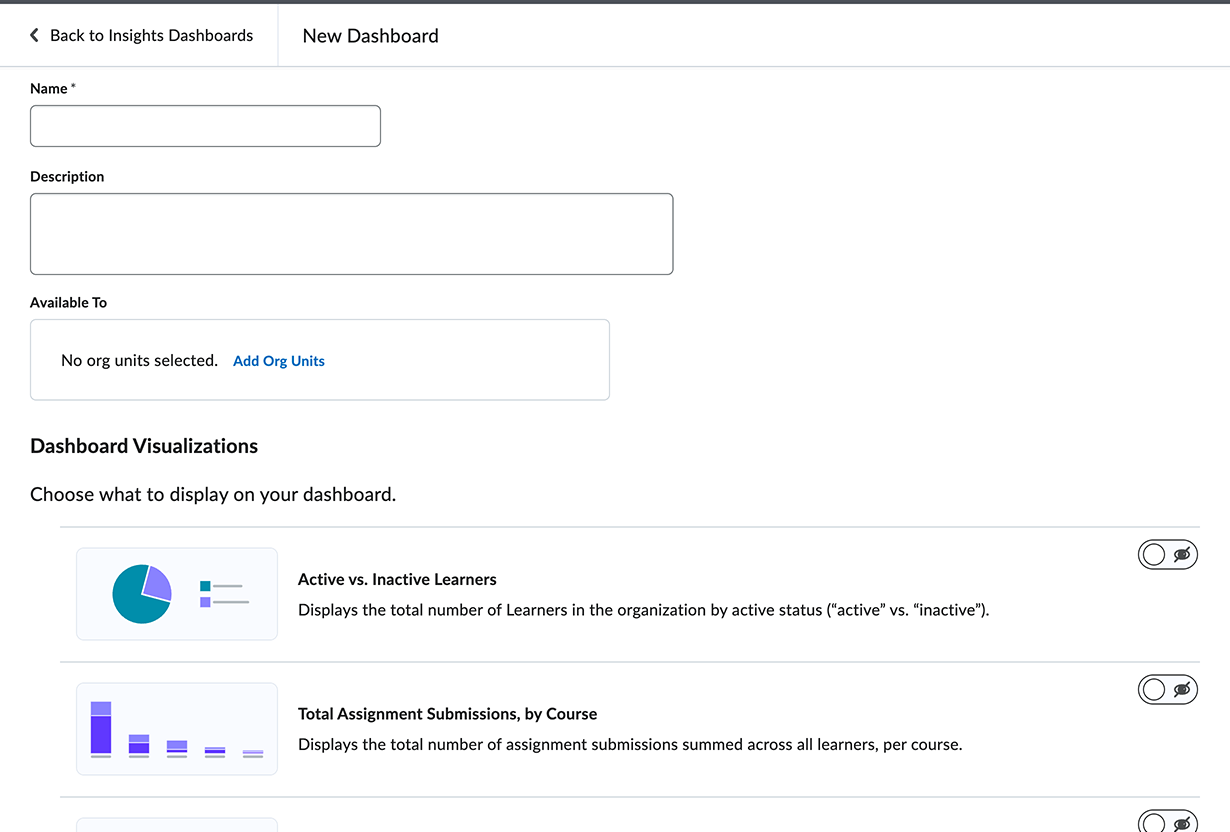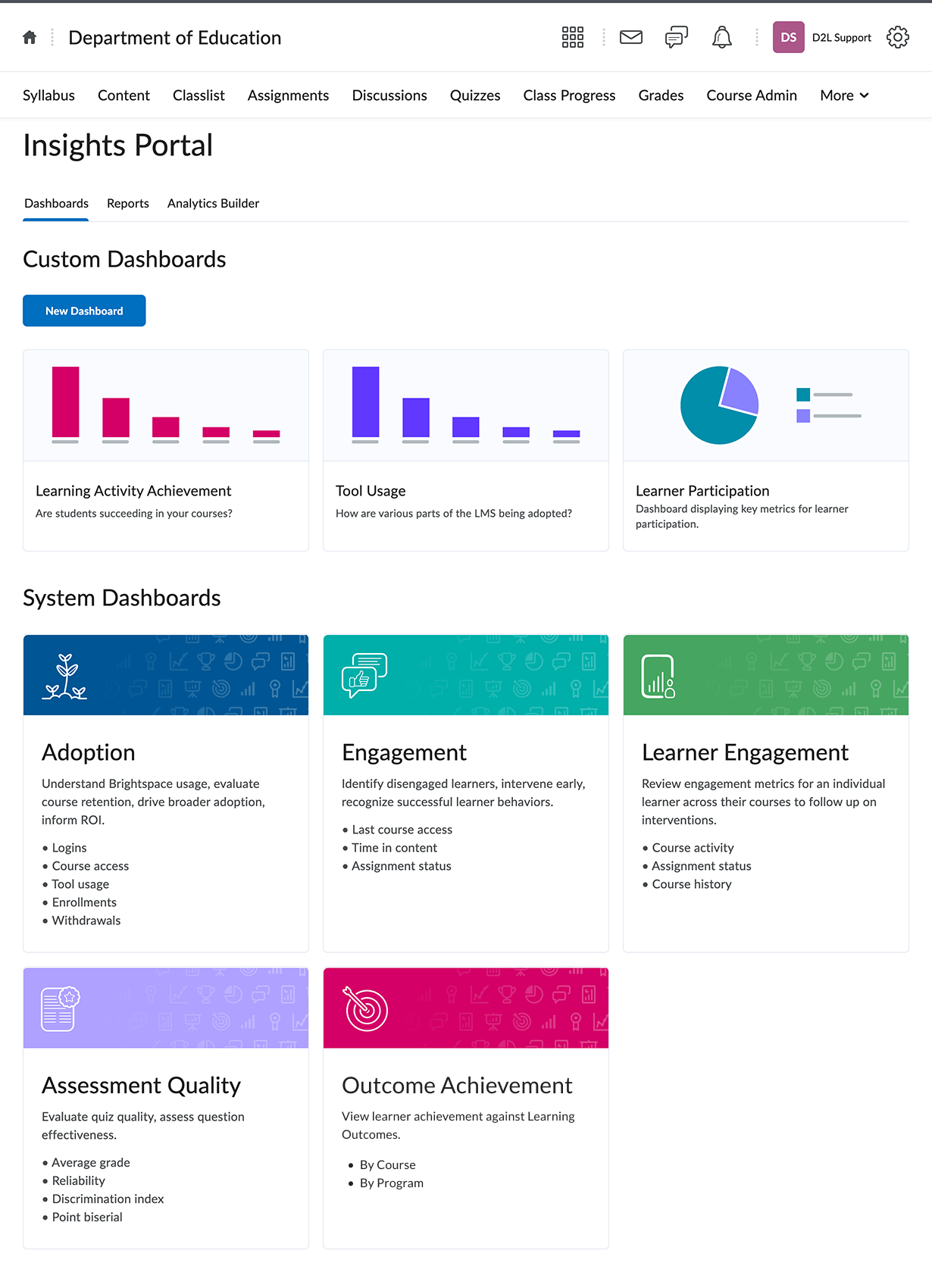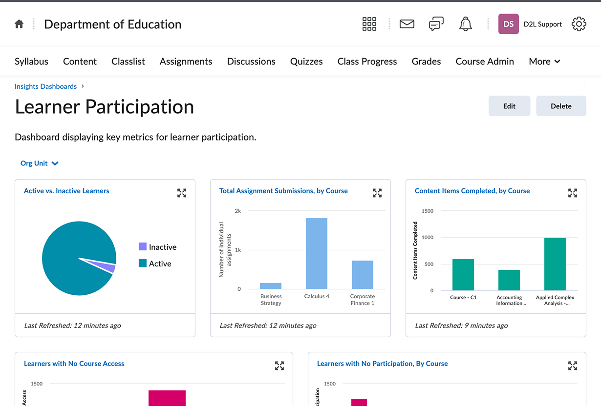 Working with product management, the decision was made to build a solution which allows users to create their own simple dashboards based on their individual needs, without requiring them to understand complex table joins or SQL queries. I designed the basic create / edit workflow, and the layout and visuals for the most common metrics that educators want to see. This design work involved choosing the right visualization for the data, and working with the engineering team to ensure colour combinations and hover states were accessible.